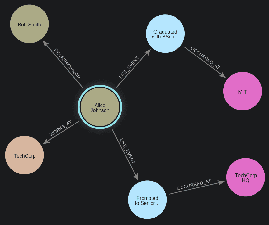 When working with graphs, we can use certain Organizational Principles. These are ways to guide us in structuring a specific domain faithfully based on concepts and rules. In graphs, an organizational principle can be the categorization of entities and relationships for our particular use case. We can represent these as nodes and edges. For our AI Companion case, we need to define organizational principles that faithfully represent a person’s life and relationships more efficiently.