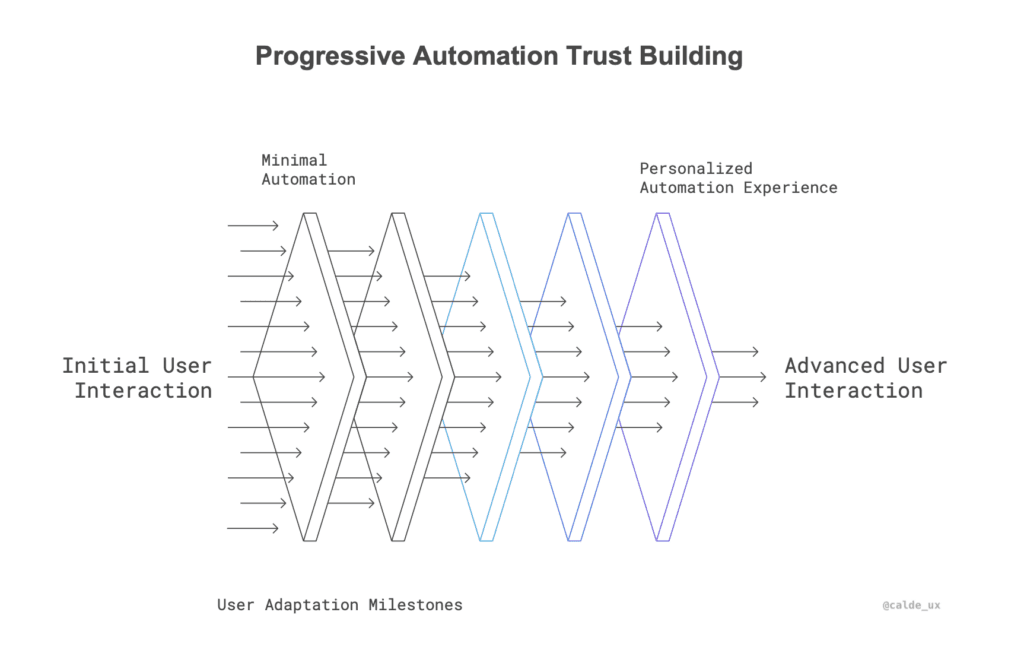 Building on this, we’ve been exploring an idea: could progressive automation—starting with minimal automation and increasing it gradually—help build trust and create more dynamic AI systems? This approach mirrors how humans naturally learn and adapt, beginning with manual effort and automating tasks as confidence and familiarity grow. By tailoring automation levels to user behavior and needs, AI systems might be able to foster trust over time while delivering increasingly personalized experiences.