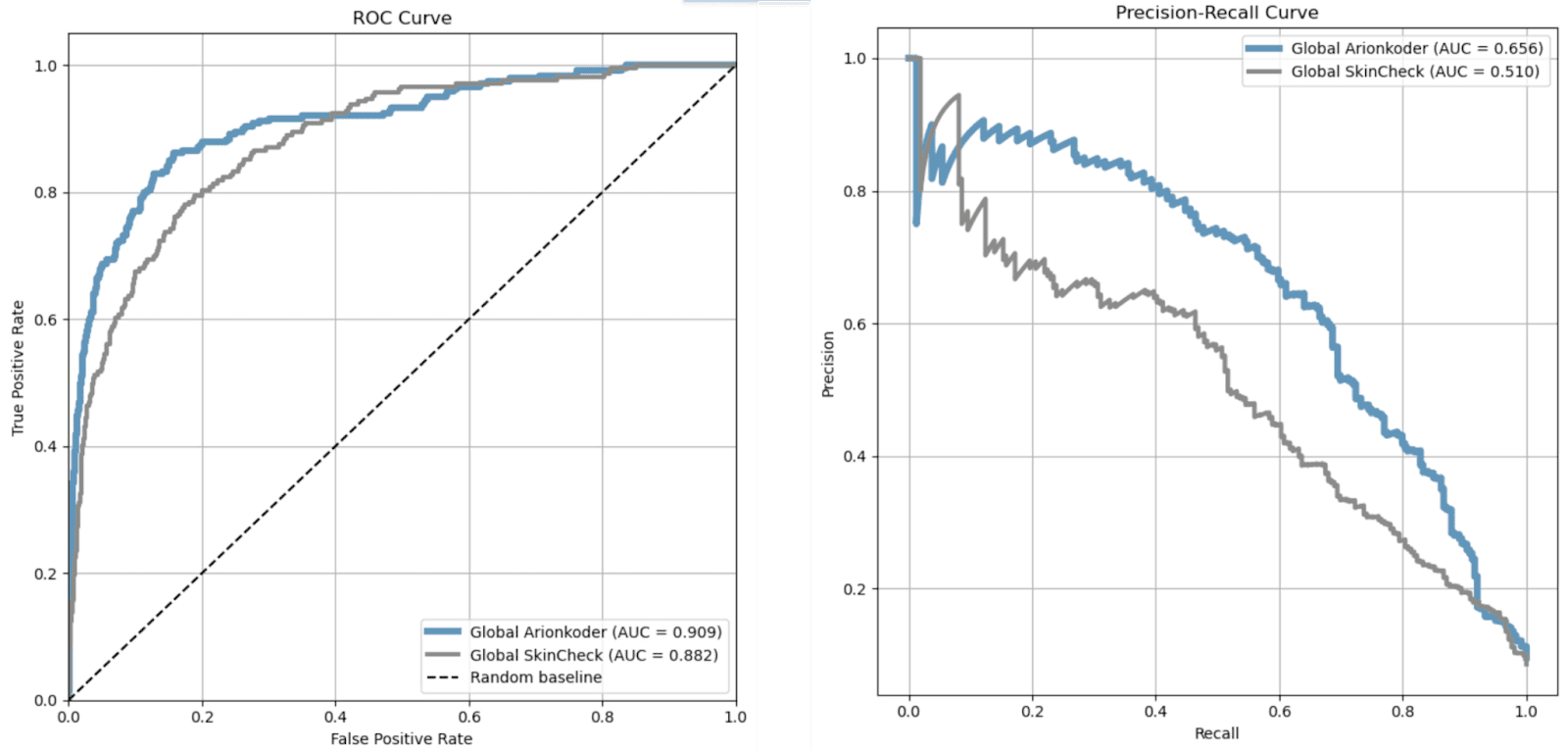 To evaluate the results, we compared our enhanced model against the original SkinCheck baseline using ROC and Precision-Recall (PR) curves. As shown below, the updated model achieved higher AUC values across both metrics: