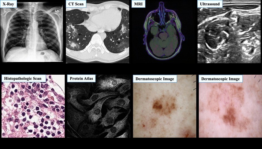 Medical images. Medicine has been revolutionized by the multiplicity of imaging acquisition devices currently available. X-rays, CT scans, MRIs, OCTs, ultrasound images, etc., are used on a daily basis for clinicians and radiologists to provide diagnosis, plan treatments, and monitor diseases. Depending on the imaging modality, this data can be 2D or 3D and sometimes includes a time dimension to capture motion, such as Cine MRIs. Automatically processing this data is a subfield of machine learning known as Computer Vision, and is challenging in itself due to the complexity and dimensionality of images. Common applications of AI in medical imaging include detecting and classifying abnormalities, assisting radiologists with diagnosis, and quantifying features from organs or lesions, among others.