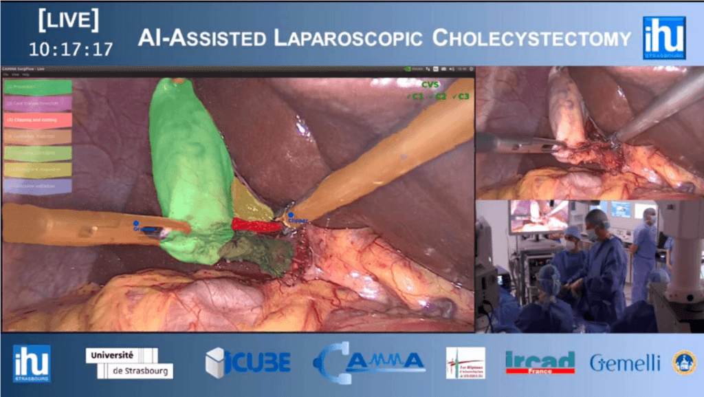Computer-aided intervention, on the other hand, is another promising field for applying AI. These tools are increasingly used by surgeons to complement their skills and assist them when performing complex procedures. By analyzing patient data and providing real-time guidance, these AI-driven solutions can help to reduce the risks and improve the outcomes. In colorectal interventions, for instance, computer vision models can be used to automatically detect polyps that need to be removed by the clinician, directly from the interventional footage. Similarly, laparoscopic surgeries can be assisted by AI algorithms that detect the location of tools and organs and prevent accidents or confusion.