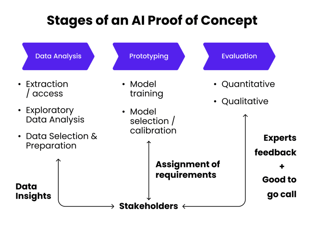The PoC evaluates the feasibility of the project with the given data quantity and quality provided by clients. Samples are analyzed to extract valuable insights, which are then used in the context of predefined ML tasks. Alternative ML algorithms are trained and compared to identify which are most suited for implementation and which are suboptimal, computationally expensive, or require too much data, etc.