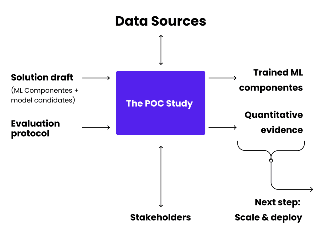 A PoC is a short-term, focused pilot study in which theories and assumptions made during solution design are tested through hands-on development. During a PoC, the major ML components of the AI solution are trained and validated using established data sources, without considering secondary elements of the solution. This allows for the confirmation of key technical decisions in just a few weeks and provides valuable quantitative information about the operational value of the AI solution before scaling to production or making further investments in its implementation.