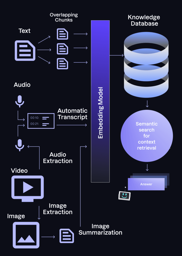 Achieving this capability remains a challenge, though. It requires a proficient team that can generate a custom data processing layer capable of transforming data in multiple formats into elements compatible with the embeddings model. For example, at Arionkoder, we harness GPT-4 Vision to extract textual insights from screenshots of our demos or slides. Then, these in-depth summaries can be processed by the LLMs just as we do with the text chunks. Similarly, for video and audio, we extract transcripts with timestamps using off-the-shelf tools, enabling us to pose questions and receive immediate references to specific moments with the appropriate prompting and storage.