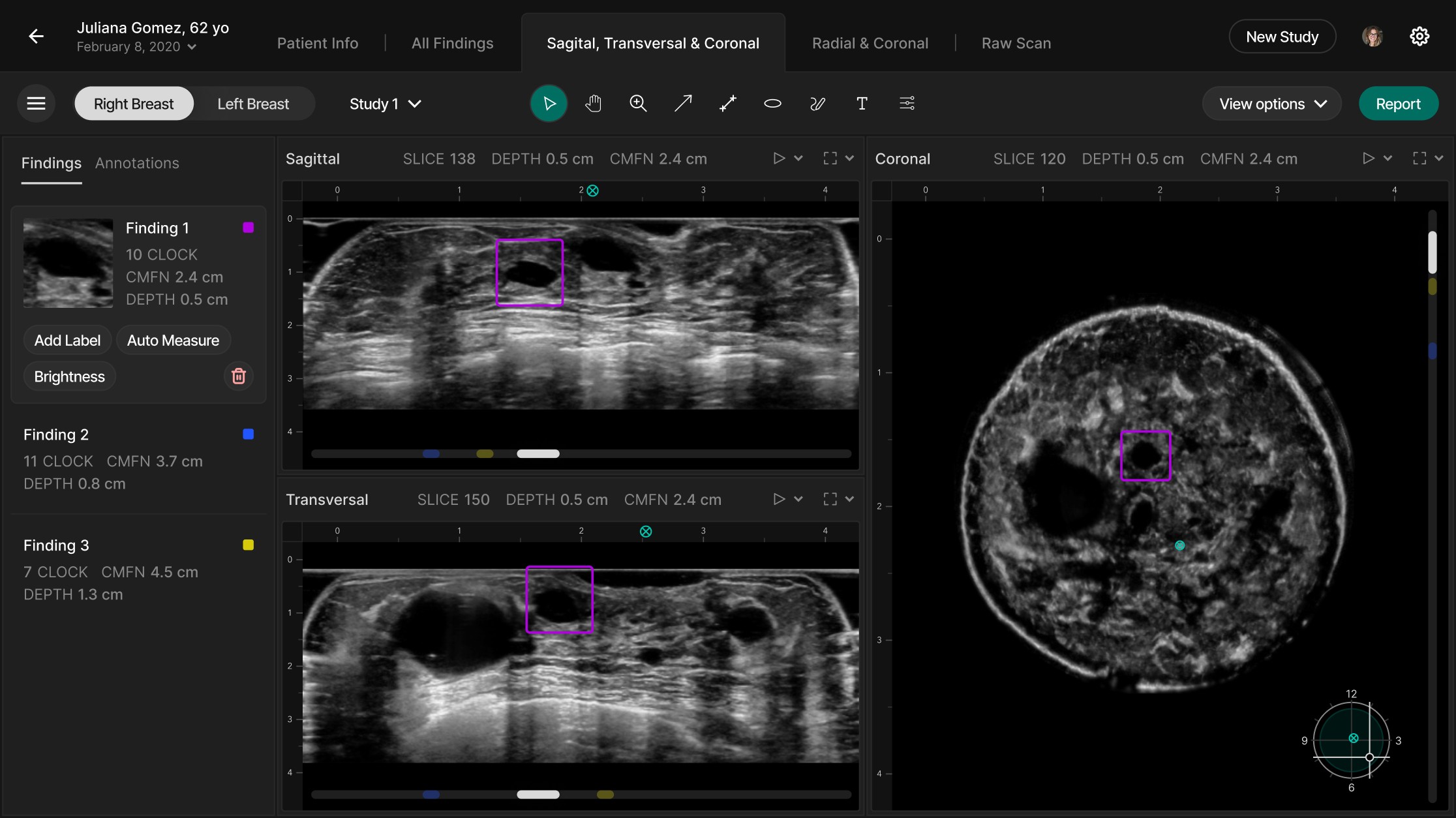 In UX/UI, we redesigned the review interface to surface only the most relevant 3D images (those flagged by AI), with an option to expand into a multi-plane comparison mode. The redesigned Scrubber allows radiologists to navigate slices quickly and correlate findings across planes, improving interpretation speed and clarity.