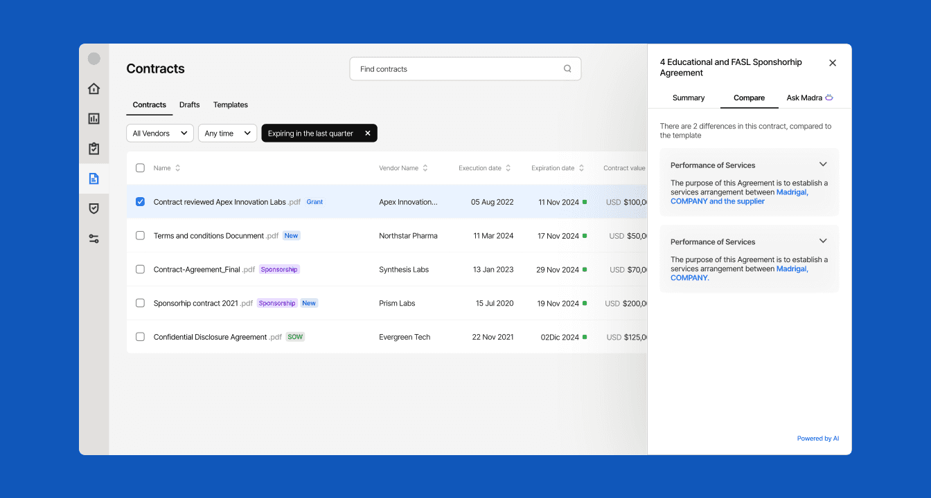 Template comparison Designed AI-generated summaries highlighting key deviations, replacing manual side-by-side reviews.