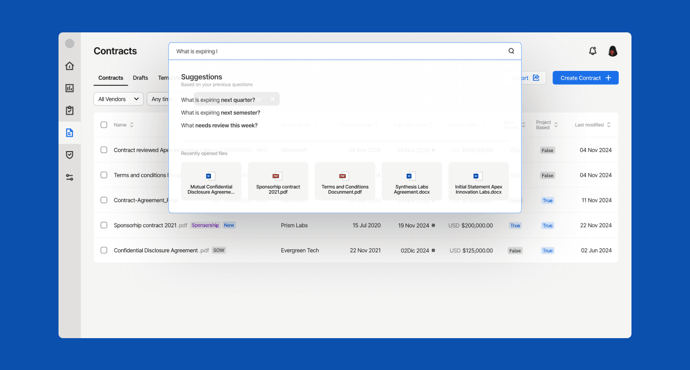 Combined LLM reasoning with metadata and keyword search for smarter contract discovery.