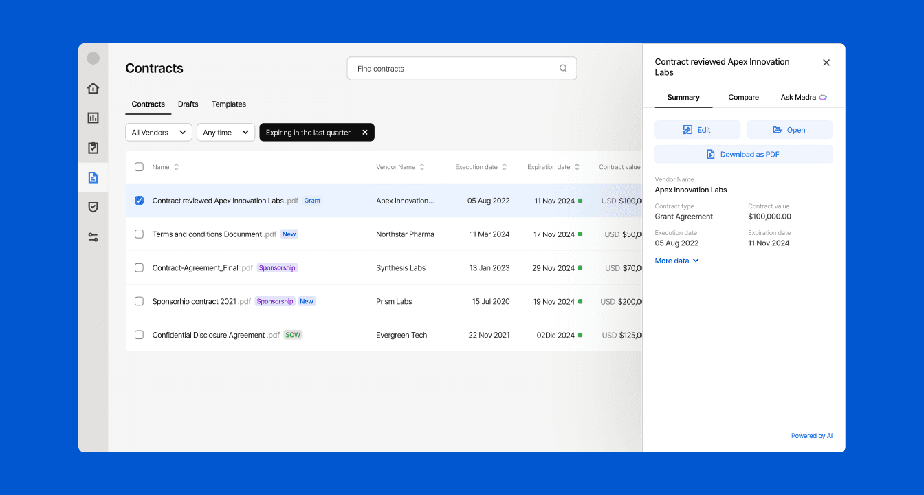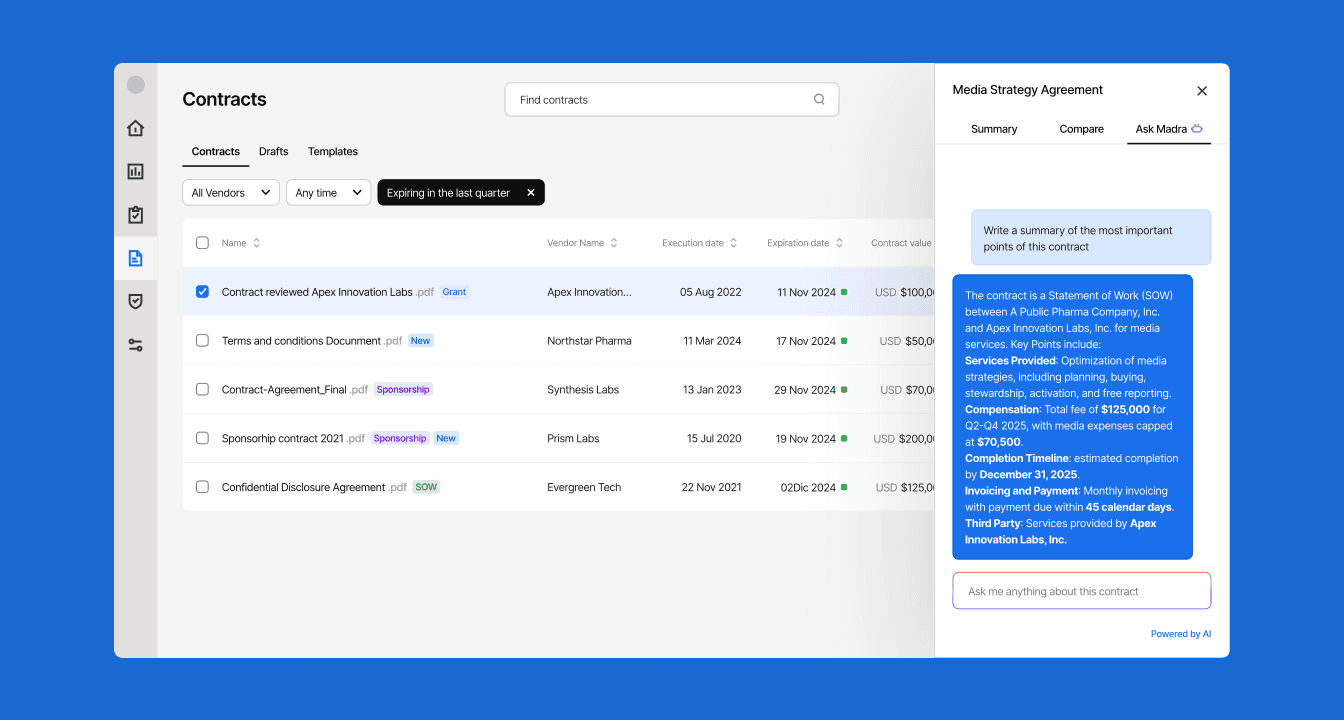 Deployed multimodal LLMs to parse contracts and auto-populate fields such as expiration or signature dates, achieving high reliability with exceptions flagged for legal validation.Contract chatbot (“Madra”)